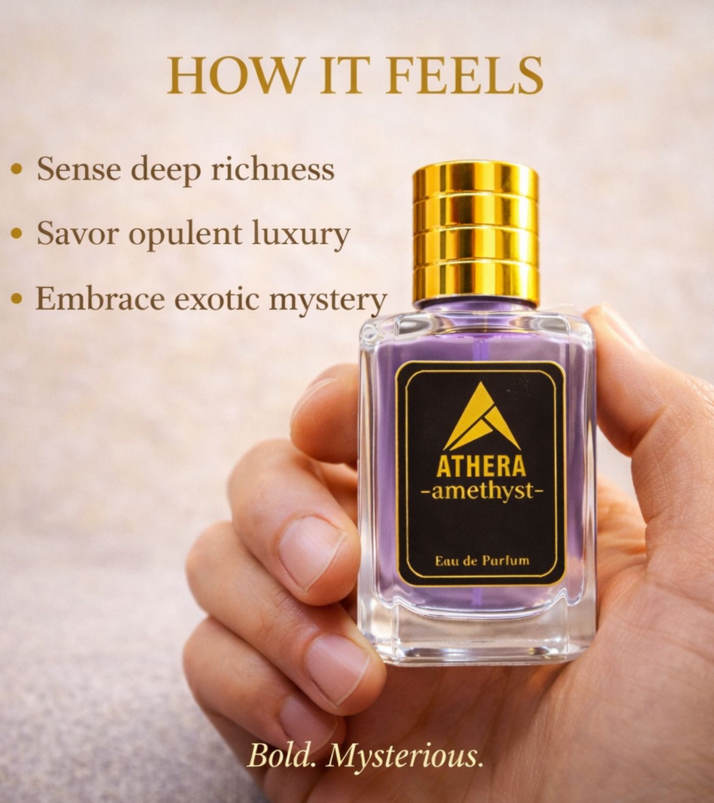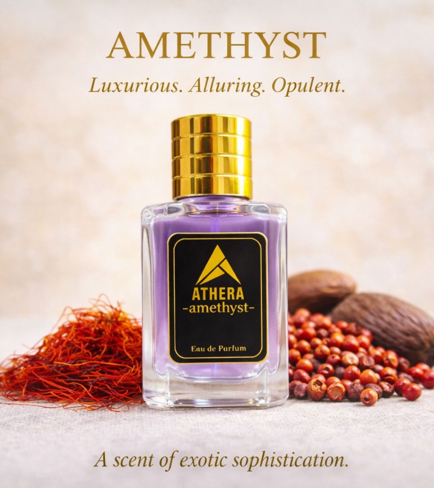 Athera Amethyst Eau de Parfum is a bold, luxurious fragrance crafted for those who are drawn to mystery, depth, and refined intensity. Rich yet elegant, this scent captures the essence of exotic opulence—where precious spices meet deep woods.