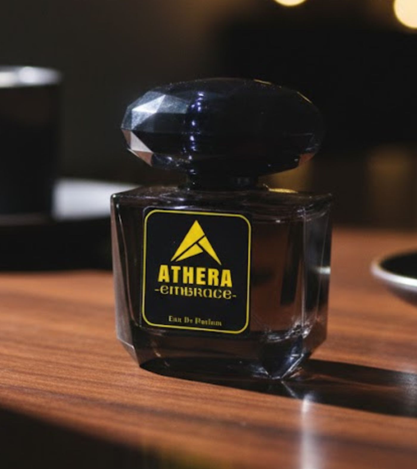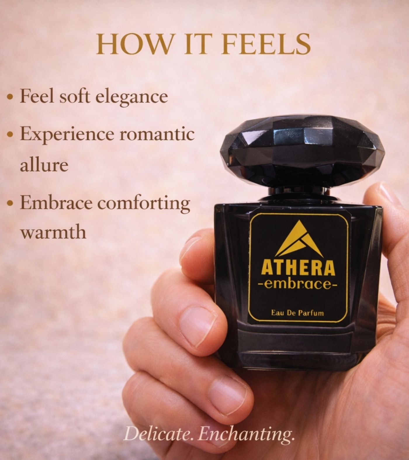 Encased in a luxurious dark bottle with a faceted gemstone-style cap, Athera Embrace reflects the essence of the fragrance itself—romantic, graceful, and emotionally rich.
